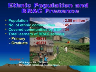 This document summarizes BRAC's Education for Ethnic Children (EEC) program which aims to provide education to ethnic minority children in Bangladesh. Some key points: