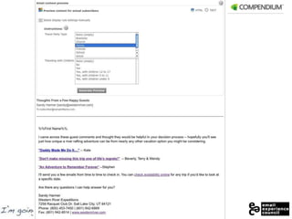 The document discusses using email marketing and social media marketing to drive new customer acquisition. It provides strategies for using platforms like email, blogs, Facebook, Twitter, and user generated content. Some key recommendations include personalizing email content based on customers' interests, engaging customers on social media before and after trips, using automated emails and surveys to generate user content for marketing, and inviting past customers to connect on social platforms to increase engagement. Measurement of tactics like reminder emails achieved an average click-through rate of 16%.