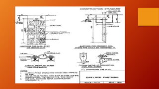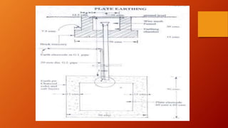 This document discusses earthing and electrical safety. It describes earthing as connecting electrical equipment to the earth to protect humans from electric shock. It then discusses different earthing methods like strip, plate, pipe and rod earthing. It explains the purpose of earthing is to protect lives and equipment from lightning and overvoltage. It also covers causes of electrical shock and types of protective devices like fuses, ELCBs and MCBs. In summary, the document outlines earthing techniques, its importance for safety, causes of shocks and protective equipment.