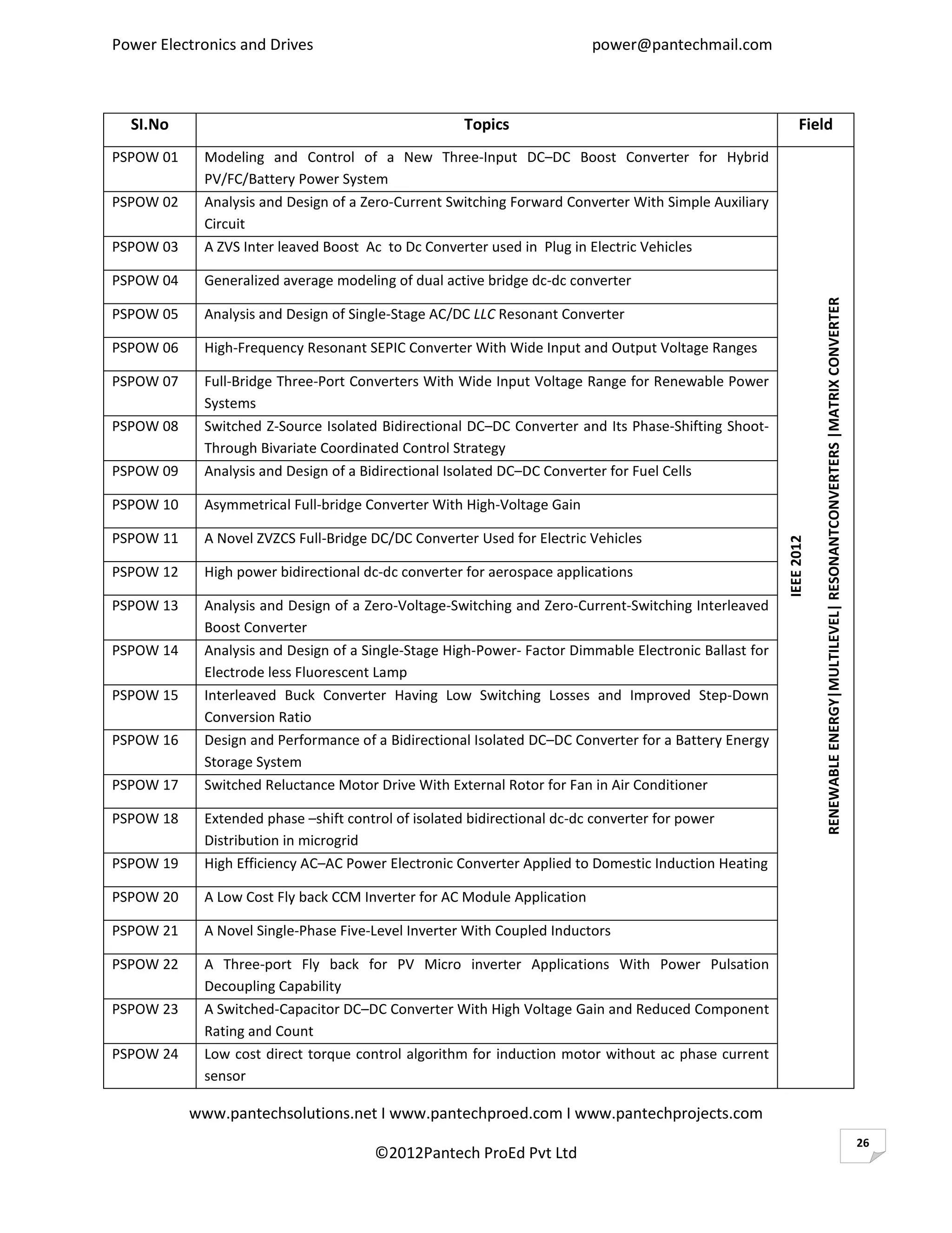 The document contains a list of 134 topics related to power electronics and drives. The topics cover various fields including renewable energy, multilevel converters, resonant converters, Z-source inverters, industrial drive control applications for traction systems and aircraft, and more. The list provides a short description for each topic and indicates the corresponding research field.