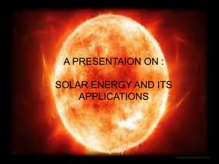 This document provides an overview of solar energy and its applications. It discusses 6 applications of solar energy: 1) solar water heaters, 2) solar cookers, 3) solar ponds, 4) solar electricity using photovoltaic cells, 5) the world scenario of large solar power plants, and 6) India's scenario and goals for solar energy. The document outlines the components and functioning of each solar energy application.