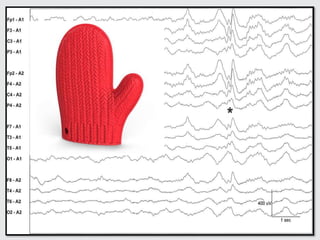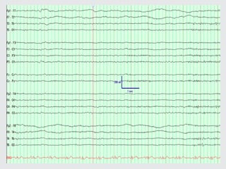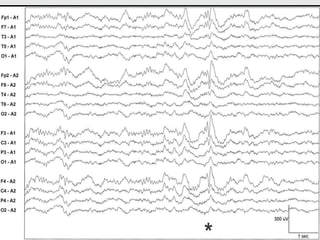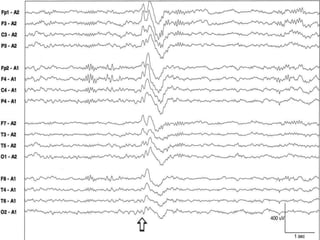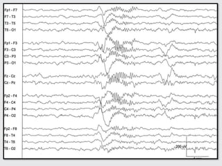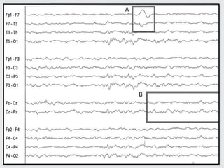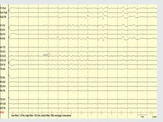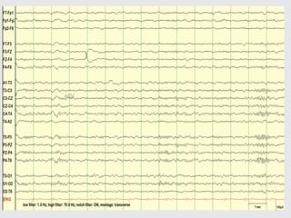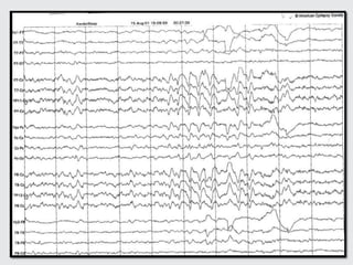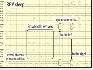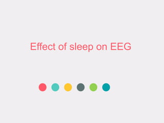 This document summarizes the effects of sleep on EEG patterns. It describes the typical EEG patterns seen in each sleep stage, including: slow rolling eye movements and alpha attenuation in stage 1; sleep spindles, K-complexes, and vertex waves in stage 2; predominant delta activity in stages 3 and 4; and EEG desynchronization along with rapid eye movements in REM sleep. Key findings are outlined for each stage to characterize normal EEG changes that occur during the sleep cycle.