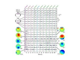 EEG artefacts arise from unwanted electrical activity from sources other than the brain, such as eye movements, muscle activity, and environmental noise. Identifying artefacts can be challenging as some resemble brain activity. Methods for removing artefacts include filtering, regression-based approaches, and independent component analysis, which transforms scalp channel data into spatially independent sources that may represent brain or non-brain activity. Careful inspection of component properties like scalp maps, time courses, and spectra is needed to classify them as representing brain activity or artefacts.