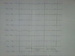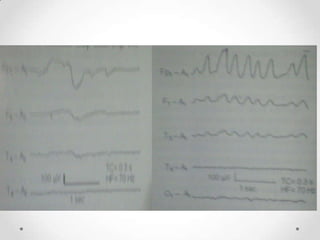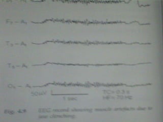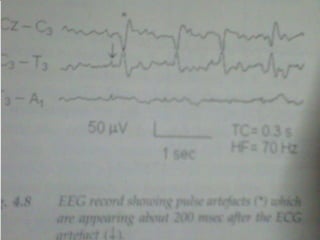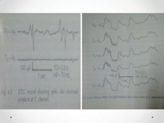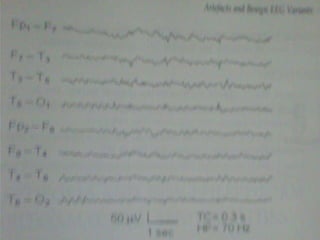 This document discusses various EEG artifacts and benign variants that can appear on an EEG reading. It describes mechanical artifacts such as those caused by electromagnetic interference, electrostatic interference, radio frequency interference, and instrument artifacts. It also discusses biological artifacts including those from eye movements, cardiac/pulse activity, electromyography, movement, skin potentials, and tongue movements. Some benign rhythmic activities and epileptiform variants are also outlined such as frontal arousal rhythm, midline theta rhythm, and 14-16Hz positive bursts. Proper identification and differentiation of artifacts and variants is important for accurate EEG interpretation.
