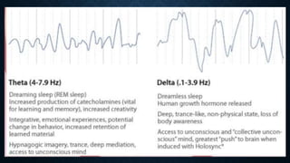 This document discusses EEG (electroencephalography) and how it can be used to control a robot with brainwaves. It describes EEG as a method to record electrical activity in the brain and how it is commonly used in medicine. It then explains that an EEG brainwave sensor analyzes brain signals, transmits them to another device, defines rules based on brainwave analytics, and uses this to control a robot. Different types of brainwaves (beta, alpha, theta, delta) are produced during different mental states and levels of brain activity.