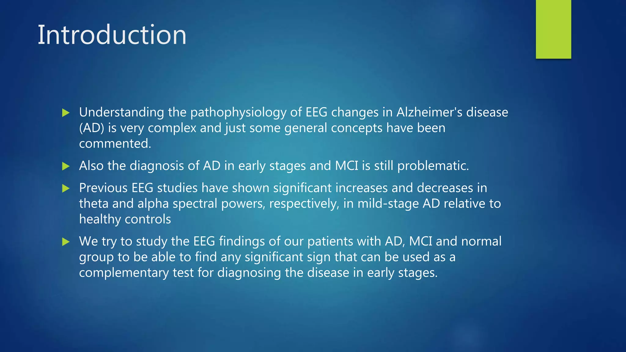 This study examines EEG changes in patients with Alzheimer's Disease (AD), Mild Cognitive Impairment (MCI), and healthy controls to identify potential biomarkers for early diagnosis. A total of 25 subjects underwent EEG testing, revealing significant variations in spectral powers, particularly in the theta and alpha bands. The findings suggest that EEG could be a promising tool for detecting AD in its pre-clinical stage, pending further validation with a larger sample size.