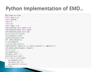The document provides a comprehensive overview of the electroencephalogram (EEG), detailing its function in detecting brain activity and abnormalities through non-invasive electrode placement on the scalp. It explains the different cortical functions monitored by EEG, the characteristics of EEG signals, their representation in time and frequency domains, and various signal processing techniques, including Fourier Transform, Short-Time Fourier Transform, Wavelet Transform, and Hilbert-Huang Transform. Additionally, it highlights the limitations and advantages of these techniques in analyzing non-stationary biological signals.