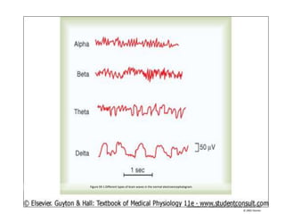This document discusses different types of brain waves seen in a normal electroencephalogram (EEG). It includes a figure showing EEG patterns of delta waves, theta waves, alpha waves, and beta waves. The figure labels the different wave types and where in the brain they are most prominent.