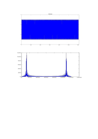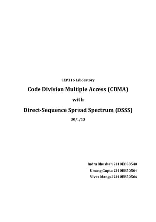 This document describes an experiment demonstrating direct-sequence spread spectrum (DSSS) communication. It discusses generating a DSSS signal by XORing a data pattern with a pseudorandom bit sequence and modulating the result. MATLAB code is provided to implement the process. Key aspects of DSSS include spreading a signal's power over a wide bandwidth to make it less susceptible to interference and more difficult to intercept without the pseudorandom sequence key. The experiment output shows the DSSS signal, its spectrum, and demodulated output. DSSS is used in applications like CDMA to transmit at low signal-to-noise ratios securely.