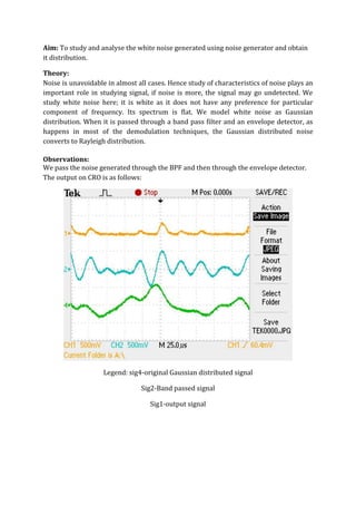1) The document analyzes white noise generated using a noise generator and examines its distribution through histograms.