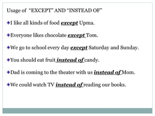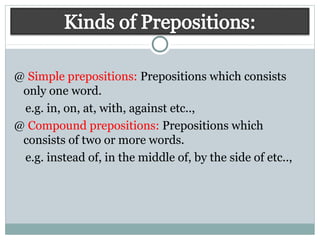 Prepositions are words that connect nouns, pronouns, or phrases to other words in a sentence. There are two types: simple prepositions, which are single words like "in" and "on", and compound prepositions which are multiple words like "instead of" and "by the side of". Prepositions also indicate place, time, or direction and are used with verbs, adjectives, and other parts of speech. Common examples of different types of prepositions and their uses are provided.