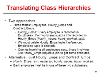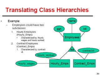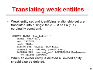 The document discusses how to transform an entity-relationship (ER) diagram into a set of relational tables by representing entities as tables, relationships as links between tables, and enforcing constraints like primary keys and foreign keys. Key steps include representing entities as tables with a primary key, relationships as links between tables with foreign keys, normalizing the tables, and merging the results. Constraints like primary keys must be unique and non-redundant, while foreign keys enforce referential integrity by linking to primary keys.