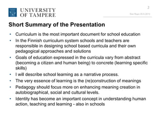 - It argues that curriculum is the most important document for schools and that learning can be understood as a narrative process of constructing meanings from experiences and integrating them into stories.