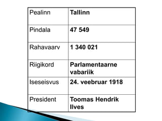 Eesti Vabariik 1. 2. 3. 5. Eesti lipp on sini-must-valgeNeed värvid tähistavad taevast, mulda ning eestlaste püüdlemist õnne ja valguse poole. 6. Eesti riigivapil on kaks kuju: suur ja väike riigivapp. Väikesel vapil on kolm lõvi, suurel vapil ümbritseb lõvisid külgedelt ja alt kaks kilbi alaosas ristuvat kuldset tammeoksa. 8. 9. 10. 11. 12.