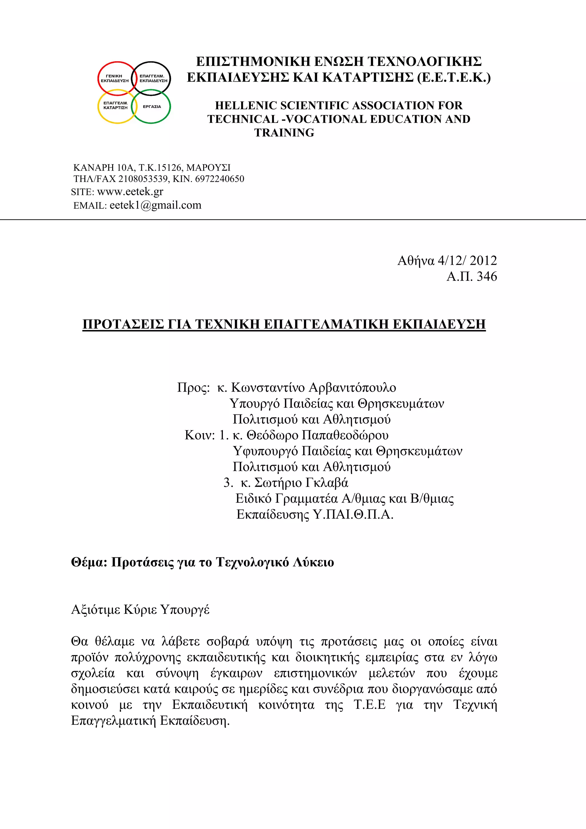 Θέμα: Προτάσεις για το Τεχνολογικό Λύκειο