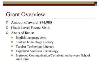This grant provides $74,900 over two years to enhance education technology and literacy at Blackstock Junior High School. The grant will focus on improving sixth grade English language arts through increased student and teacher access to up-to-date technology, professional development, and tools to improve communication between school and home. Key implementation aspects include outfitting classrooms with interactive whiteboards and online classroom websites for teachers, with requirements that teachers and students participate in surveys and technology integration.