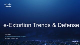 This document summarizes an presentation on e-extortion trends and defense. It discusses the evolution of extortion from early distributed denial of service attacks and ransomware to more sophisticated techniques that combine encryption, data exfiltration, and extortion demands. The presentation outlines strategies for defending against these threats, including backups, system hardening, endpoint security solutions, threat intelligence sharing, and following financial trails.