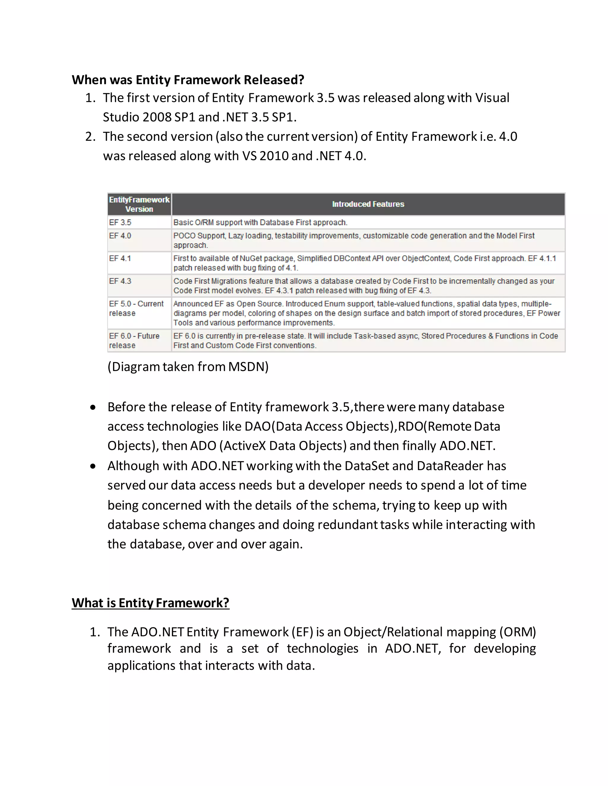 Entity Framework is an object-relational mapper (ORM) framework that was first released in .NET 3.5 SP1 along with Visual Studio 2008 SP1. The current version is Entity Framework 4.0, which was released with .NET 4.0 and Visual Studio 2010. Entity Framework provides an abstraction of ADO.NET and allows developers to work with entity classes instead of directly with the database schema. It handles CRUD operations and mapping relationships between entities and database tables. Behind the scenes, Entity Framework uses ADO.NET but abstracts these details from developers.