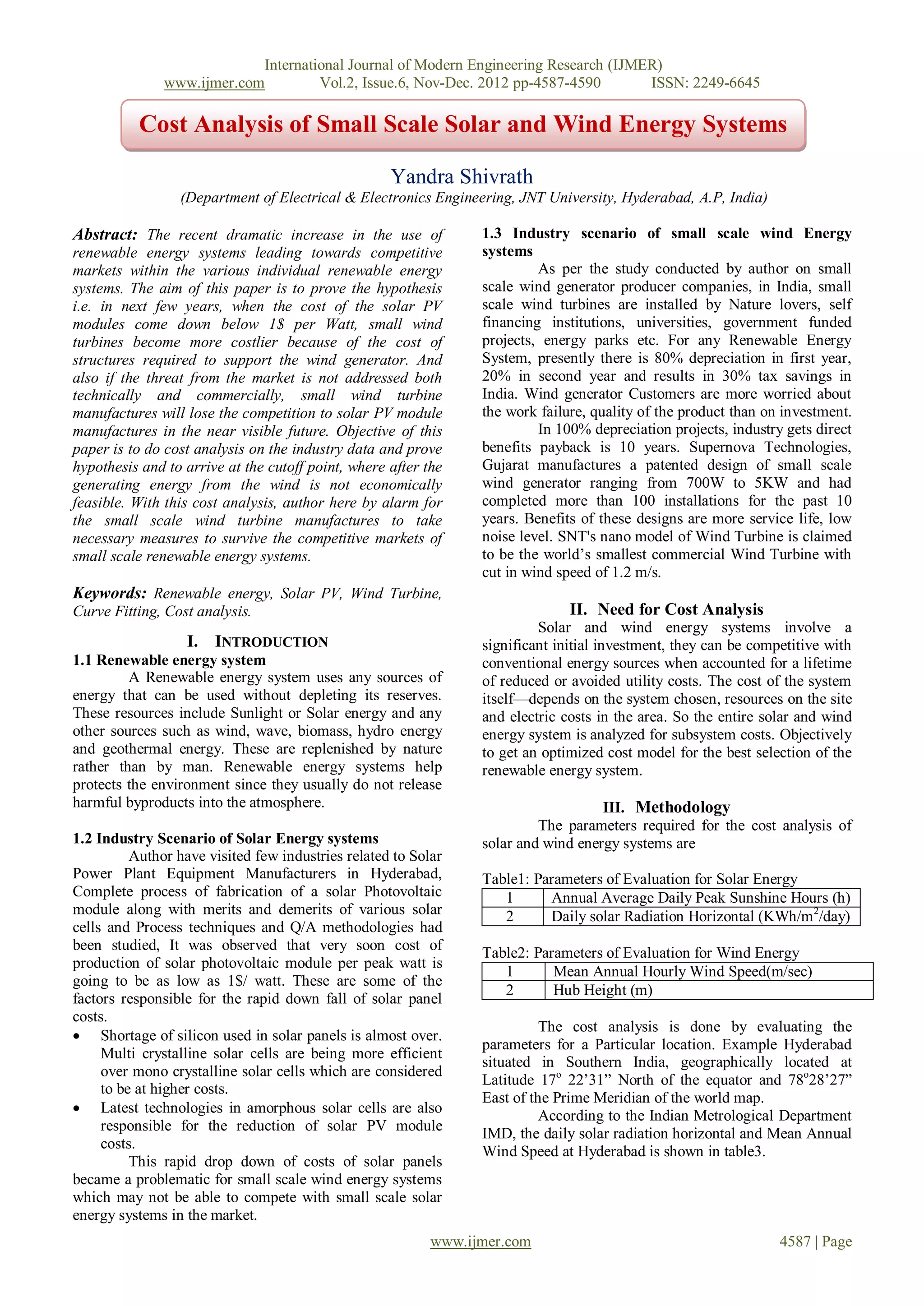 This document analyzes the cost comparison between small scale solar and wind energy systems in India, highlighting that as the cost of solar PV modules drops below $1 per watt, small wind turbines may become economically unfeasible due to higher structure costs. It presents graphs illustrating the relationship between energy demand and system costs, concluding that wind turbine manufacturers must address these pricing challenges to remain competitive. The findings suggest urgent measures are needed for small wind generator manufacturers to adapt to changing market conditions to survive.