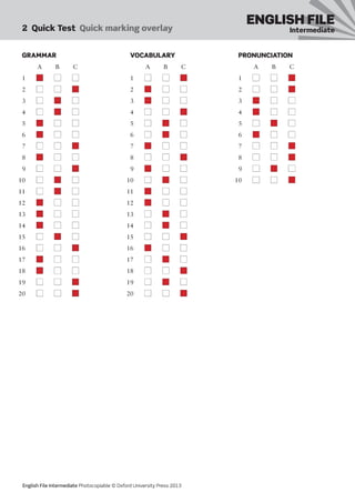 Photocopiable © Oxford University Press 2013 2  Quick Test Quick marking overlay ENGLISH FILE Intermediate GRAMMAR A B C 1 â– â– â– 2 â– â– â– 3 â– â– â– 4 â– â– â– 5 â– â– â– 6 â– â– â– 7 â– â– â– 8 â– â– â– 9 â– â– â– 10 â– â– â– 11 â– â– â– 12 â– â– â– 13 â– â– â– 14 â– â– â– 15 â– â– â– 16 â– â– â– 17 â– â– â– 18 â– â– â– 19 â– â– â– 20 â– â– â– VOCABULARY A B C 1 â– â– â– 2 â– â– â– 3 â– â– â– 4 â– â– â– 5 â– â– â– 6 â– â– â– 7 â– â– â– 8 â– â– â– 9 â– â– â– 10 â– â– â– 11 â– â– â– 12 â– â– â– 13 â– â– â– 14 â– â– â– 15 â– â– â– 16 â– â– â– 17 â– â– â– 18 â– â– â– 19 â– â– â– 20 â– â– â– PRONUNCIATION A B C 1 â– â– â– 2 â– â– â– 3 â– â– â– 4 â– â– â– 5 â– â– â– 6 â– â– â– 7 â– â– â– 8 â– â– â– 9 â– â– â– 10 â– â– â–