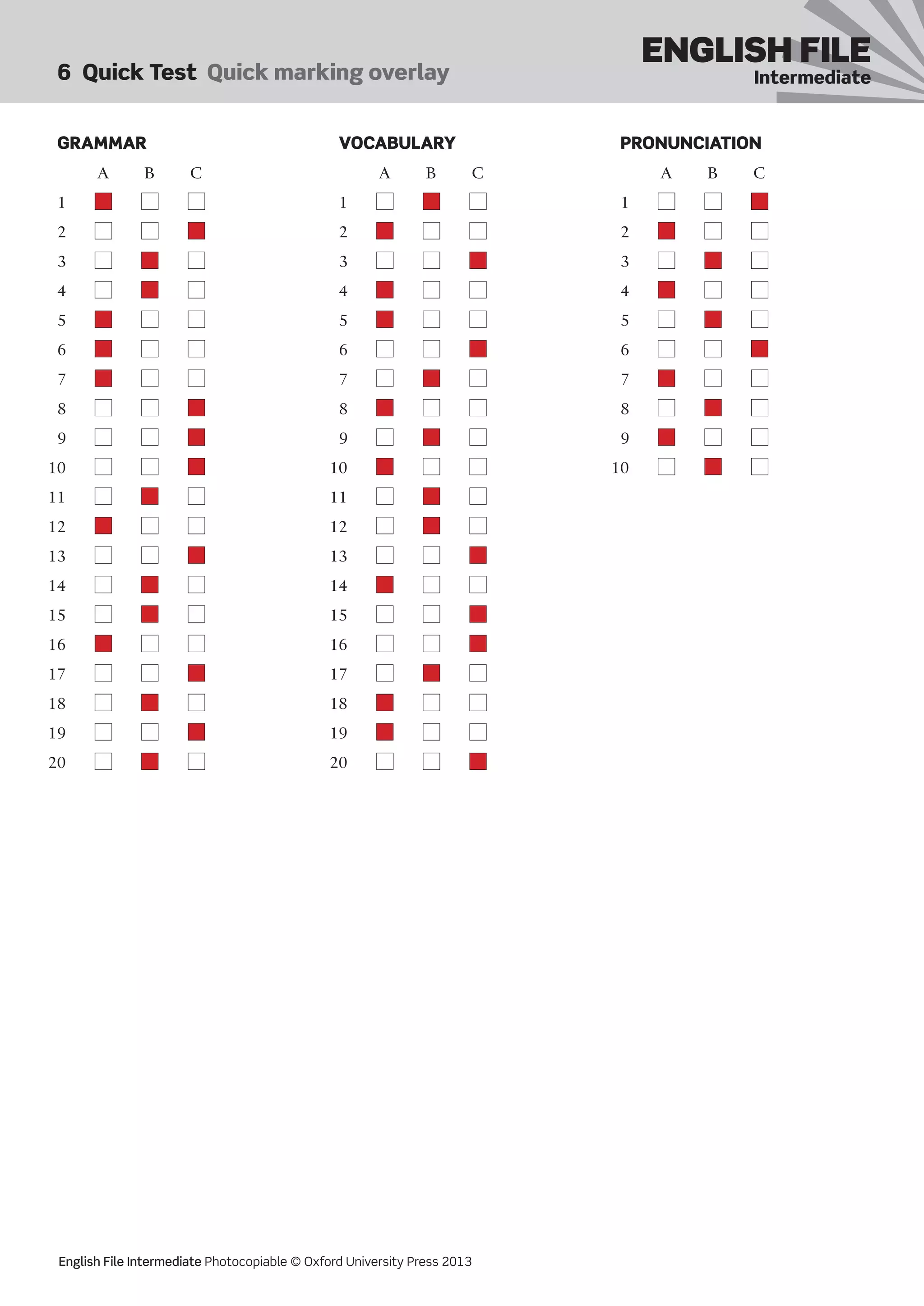 Photocopiable © Oxford University Press 2013 6 Quick Test Quick marking overlay ENGLISH FILE Intermediate GRAMMAR A B C 1 ■ ■ ■ 2 ■ ■ ■ 3 ■ ■ ■ 4 ■ ■ ■ 5 ■ ■ ■ 6 ■ ■ ■ 7 ■ ■ ■ 8 ■ ■ ■ 9 ■ ■ ■ 10 ■ ■ ■ 11 ■ ■ ■ 12 ■ ■ ■ 13 ■ ■ ■ 14 ■ ■ ■ 15 ■ ■ ■ 16 ■ ■ ■ 17 ■ ■ ■ 18 ■ ■ ■ 19 ■ ■ ■ 20 ■ ■ ■ VOCABULARY A B C 1 ■ ■ ■ 2 ■ ■ ■ 3 ■ ■ ■ 4 ■ ■ ■ 5 ■ ■ ■ 6 ■ ■ ■ 7 ■ ■ ■ 8 ■ ■ ■ 9 ■ ■ ■ 10 ■ ■ ■ 11 ■ ■ ■ 12 ■ ■ ■ 13 ■ ■ ■ 14 ■ ■ ■ 15 ■ ■ ■ 16 ■ ■ ■ 17 ■ ■ ■ 18 ■ ■ ■ 19 ■ ■ ■ 20 ■ ■ ■ PRONUNCIATION A B C 1 ■ ■ ■ 2 ■ ■ ■ 3 ■ ■ ■ 4 ■ ■ ■ 5 ■ ■ ■ 6 ■ ■ ■ 7 ■ ■ ■ 8 ■ ■ ■ 9 ■ ■ ■ 10 ■ ■ ■