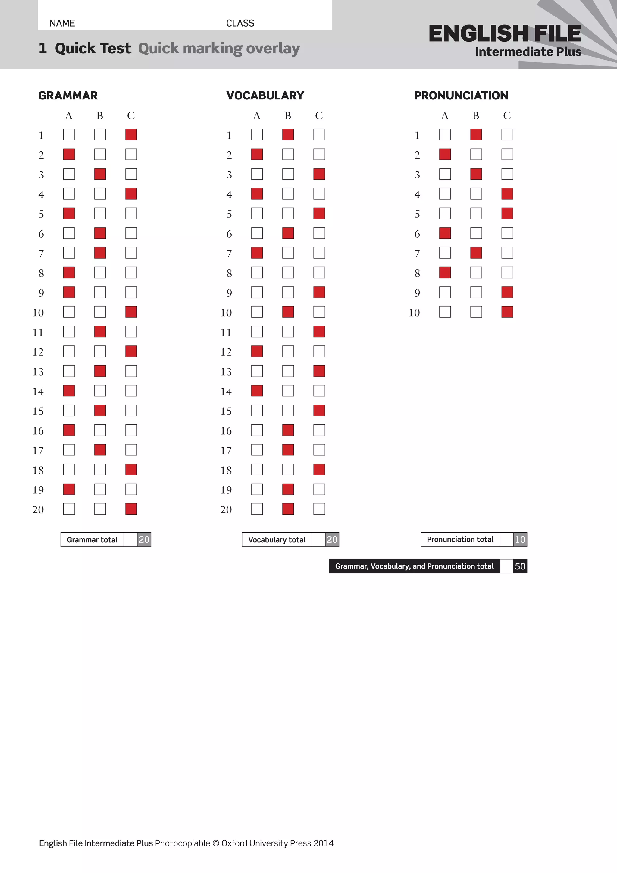 Plus Photocopiable © Oxford University Press 2014 NAME CLASS 1  Quick Test Quick marking overlay ENGLISH FILE Intermediate Plus GRAMMAR A B C 1 ■■■2 ■■■3 ■■■4 ■■■5 ■■■6 ■■■7 ■■■8 ■■■9 ■■■10 ■■■11 ■■■12 ■■■13 ■■■14 ■■■15 ■■■16 ■■■17 ■■■18 ■■■19 ■■■20 ■■■Grammar total 20 VOCABULARY A B C 1 ■■■2 ■■■3 ■■■4 ■■■5 ■■■6 ■■■7 ■■■8 ■■■9 ■■■10 ■■■11 ■■■12 ■■■13 ■■■14 ■■■15 ■■■16 ■■■17 ■■■18 ■■■19 ■■■20 ■■■Vocabulary total 20 PRONUNCIATION A B C 1 ■■■2 ■■■3 ■■■4 ■■■5 ■■■6 ■■■7 ■■■8 ■■■9 ■■■10 ■■■Pronunciation total 10 Grammar, Vocabulary, and Pronunciation total 50