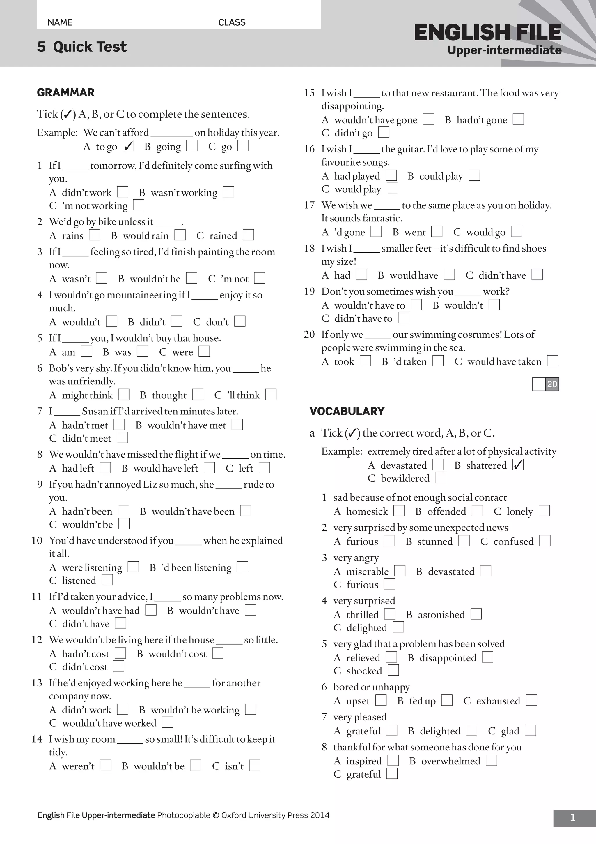 This document contains an English test with multiple choice questions testing grammar, vocabulary, and pronunciation. The test includes 20 grammar questions, 20 vocabulary questions, and 10 pronunciation questions testing word stress and distinguishing different sounds. The questions cover topics like conditional sentences, reported speech, synonyms for emotions, correctly using prefixes like dis-, and identifying stressed syllables.