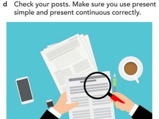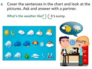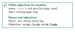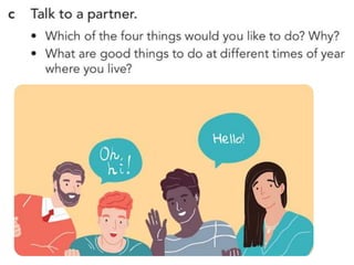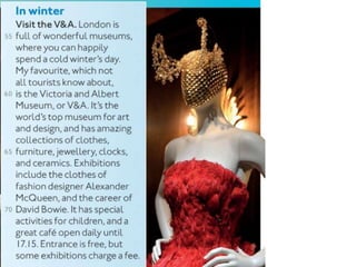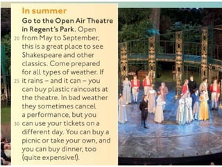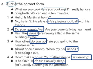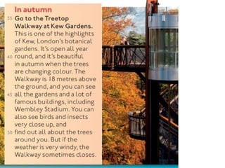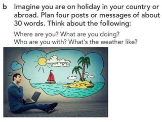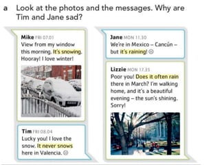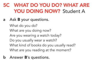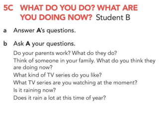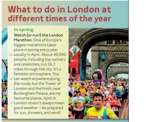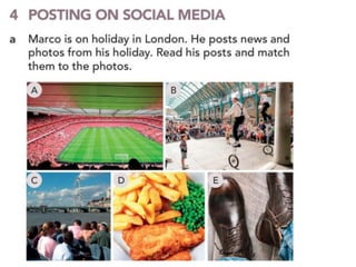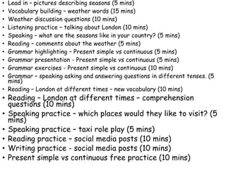 This document outlines the lesson plan and activities for an English language lesson about the present continuous versus the present simple tenses. The lesson includes vocabulary building, discussions, readings, grammar explanations and exercises comparing the two tenses. Students practice asking and answering questions in different tenses, read texts about London at different times of year, and do speaking and writing activities about weather and social media posts.