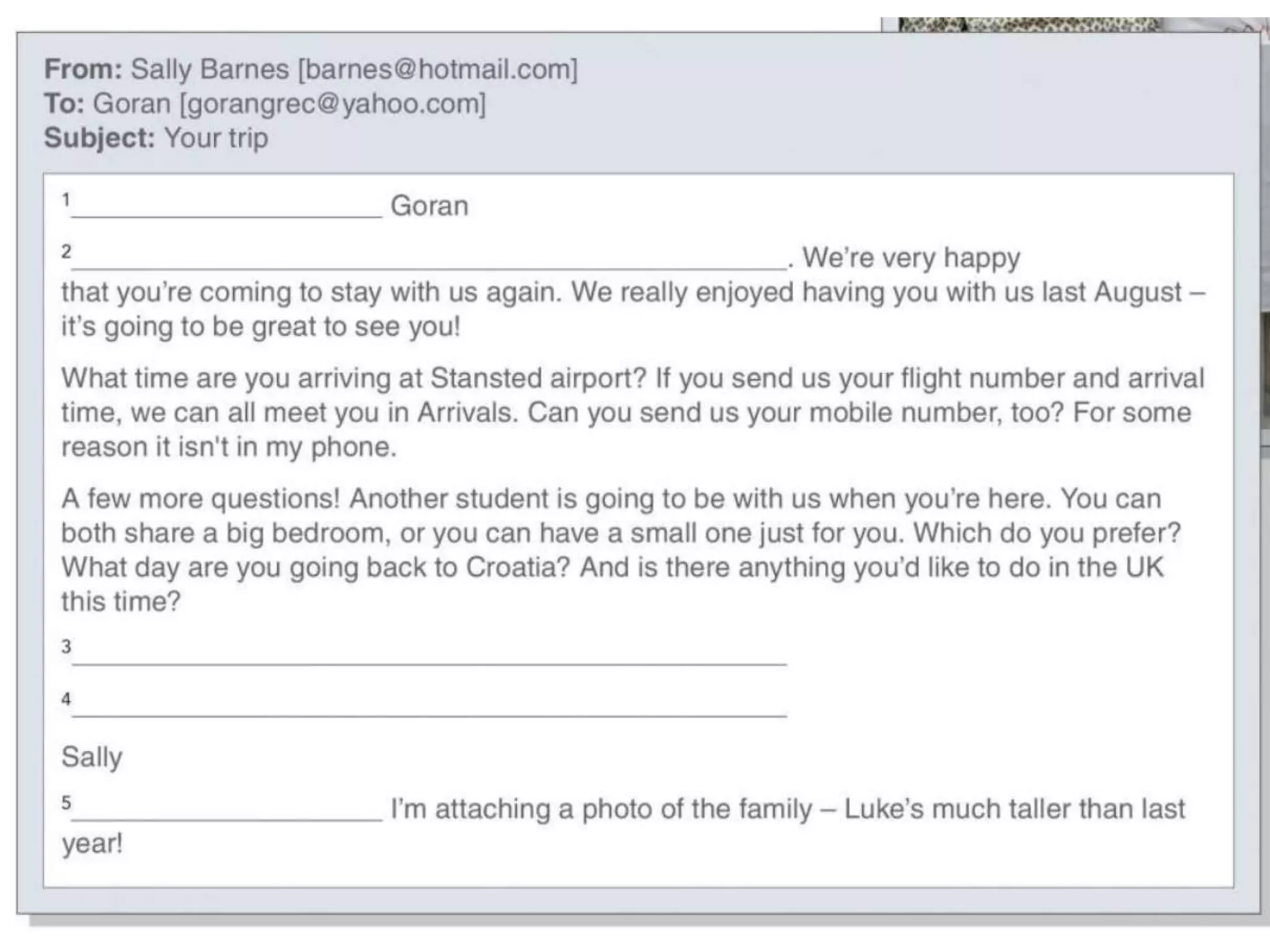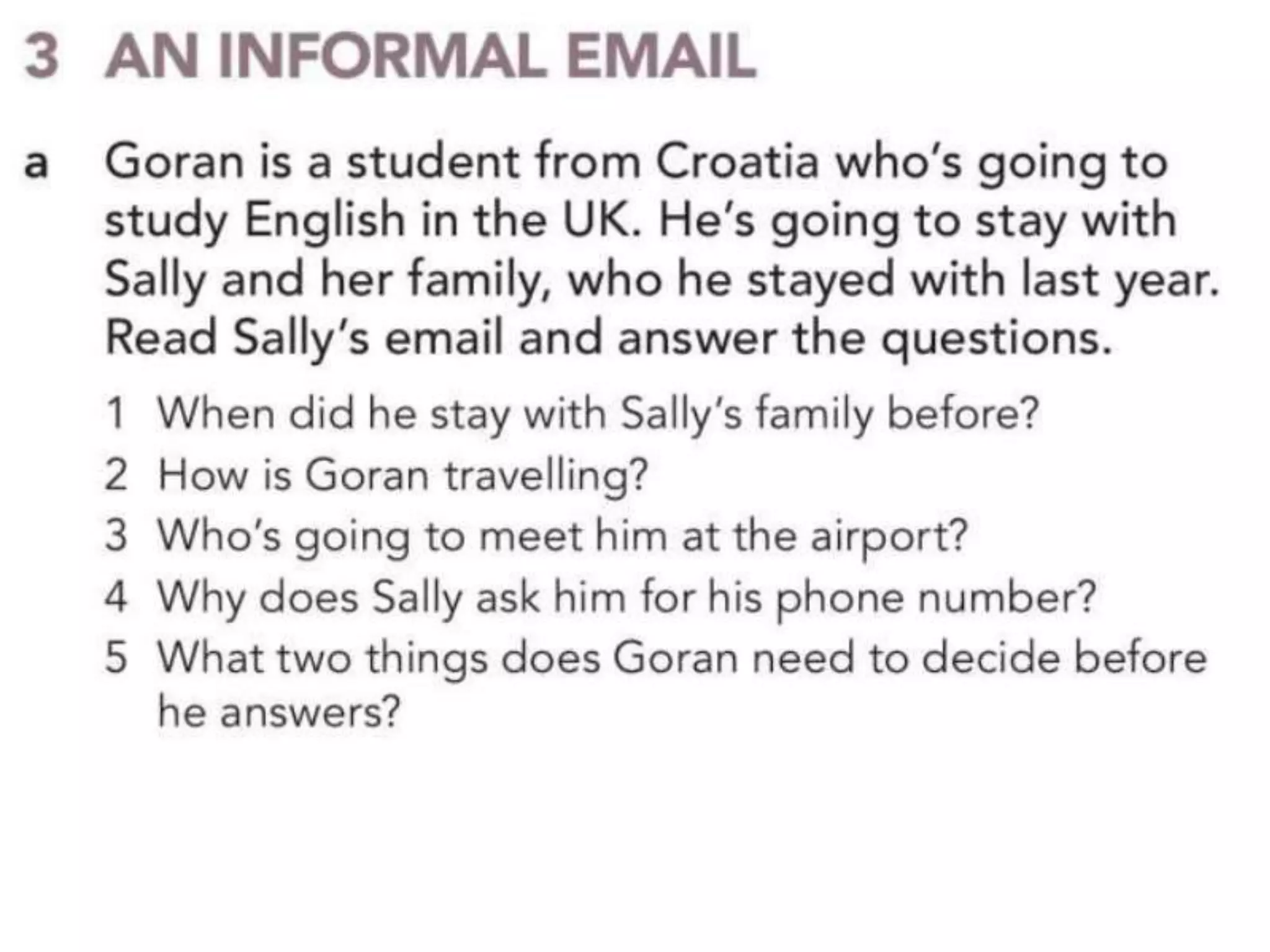 The document provides details for Sally's upcoming trip to the UK. It lists information to share with Sally, including the arrival time and flight number of her plane, a phone number, and that she needs to decide which bedroom to sleep in and what attractions to visit while in the UK. The document also mentions briefly discussing with her family whether to share a bedroom and activities of interest.