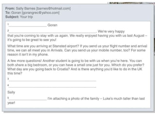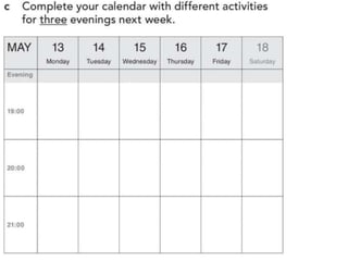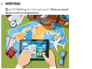 The document outlines the schedule and activities for an English language lesson, including warm up exercises, vocabulary building, grammar lessons, speaking and writing practice, and a class quiz. Various exercises and tasks are listed along with their timing and focus areas like the present continuous tense, making arrangements, and writing an informal email. Sample dialogs and texts are also provided to work on skills like asking questions, changing reservations, and role plays.