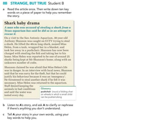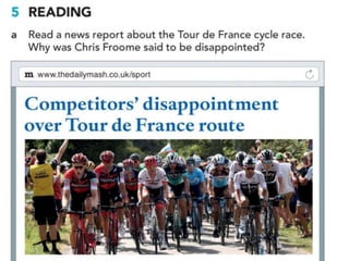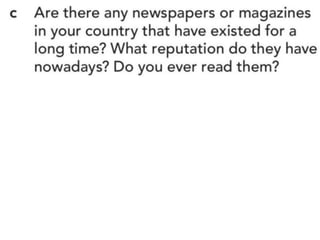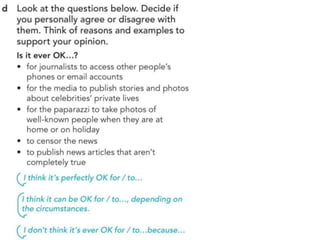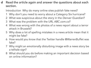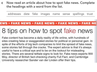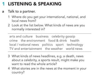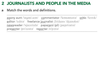 The document outlines various activities and lessons focused on family vocabulary, grammar principles regarding possessives, and speaking practice, emphasizing interviewing techniques and reporting verbs. It includes exercises like a riddle quiz, reading comprehension, and listening practice about family discussions. Additionally, it covers identifying fake news sources and the evolution of communication in journalism.