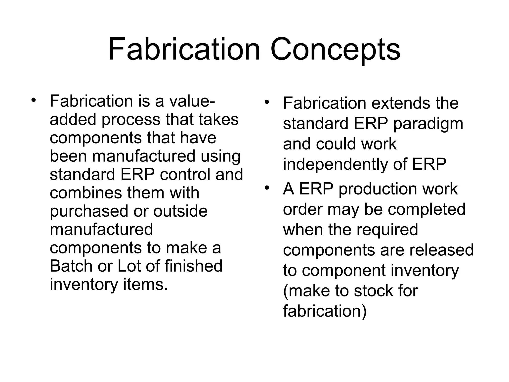 This document describes a fabrication module design that extends standard ERP production processes. Fabrication involves combining manufactured components with purchased parts to create finished inventory items in batches. Key concepts covered include fabrication work orders, component inventory, bills of materials specifying fabrication requirements, routing plans detailing work center processes, and accounting for actual costs while using standard costs where needed. The goal is to track costs from raw materials to finished goods for fabricated products.