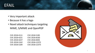 The document discusses the efail attack, which exploits vulnerabilities in S/MIME and OpenPGP email encryption standards, allowing attackers to exfiltrate sensitive information. It highlights various techniques used to breach email encryption and emphasizes the need for improvements in cryptographic standards and implementations. The authors propose recommendations for short-term and long-term countermeasures to enhance email security.