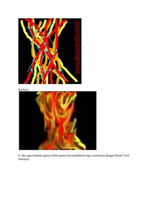 Dokumen ini adalah tutorial Photoshop tentang cara membuat efek foto kobaran api dari coretan. Langkah-langkah yang dijelaskan meliputi pembuatan lembar kerja, penggunaan brush tool dan smudge tool, serta modifikasi untuk mempercantik hasil akhir. Tutorial ini juga menyediakan tautan untuk dibagikan.