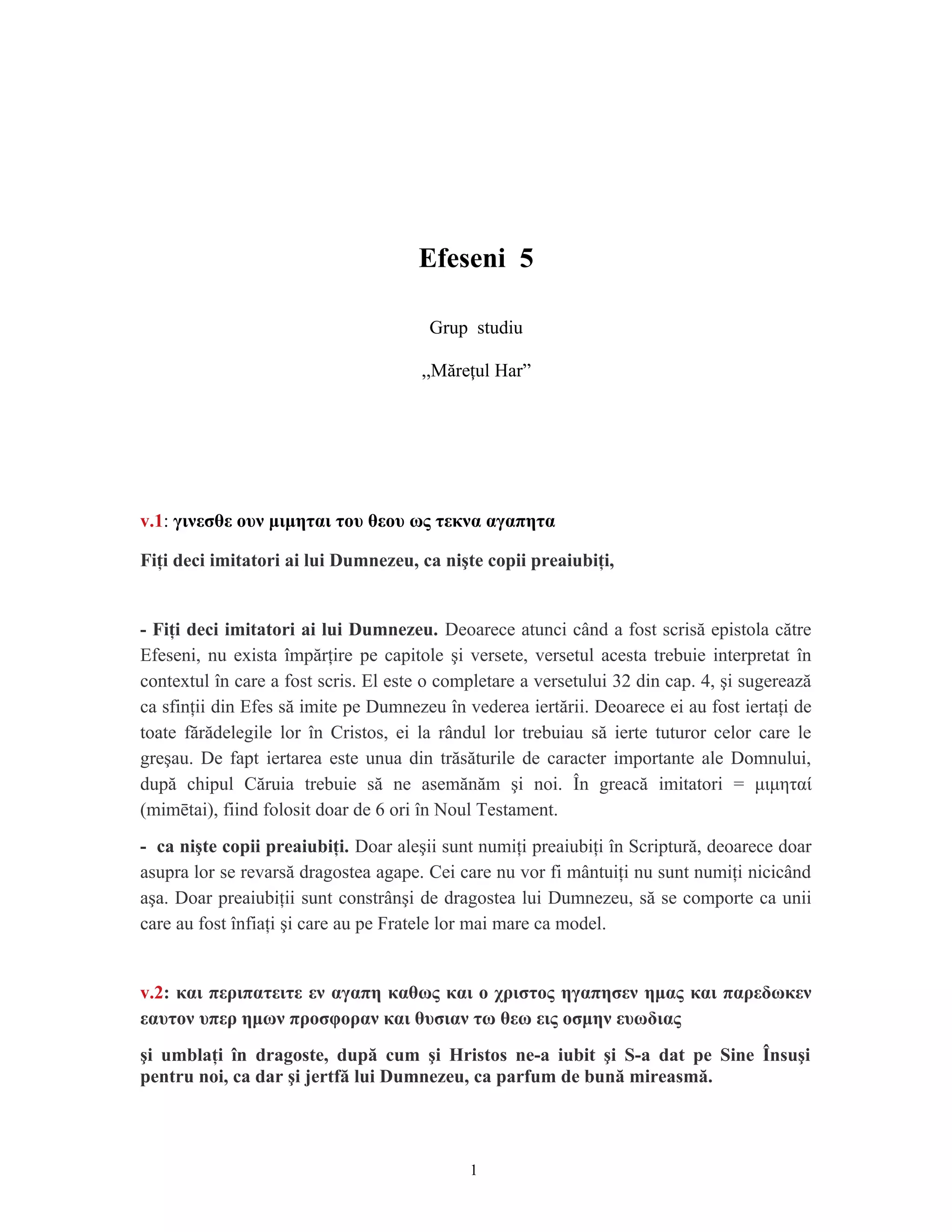 Epistola către Efeseni subliniază importanța de a fi imitatori ai lui Dumnezeu prin iubire și iertare, reflectând trăsăturile divine în comportamentul credincioșilor. Autorul avertizează împotriva păcatelor precum curvia, necurăția și lăcomia, subliniind că cei care persistă în aceste comportamente nu vor moșteni împărăția lui Dumnezeu. Documentul îndeamnă la umblarea în lumină și la faptele bune derivate din bunătate, dreptate și adevăr, caracteristici esențiale ale vieții în Hristos.