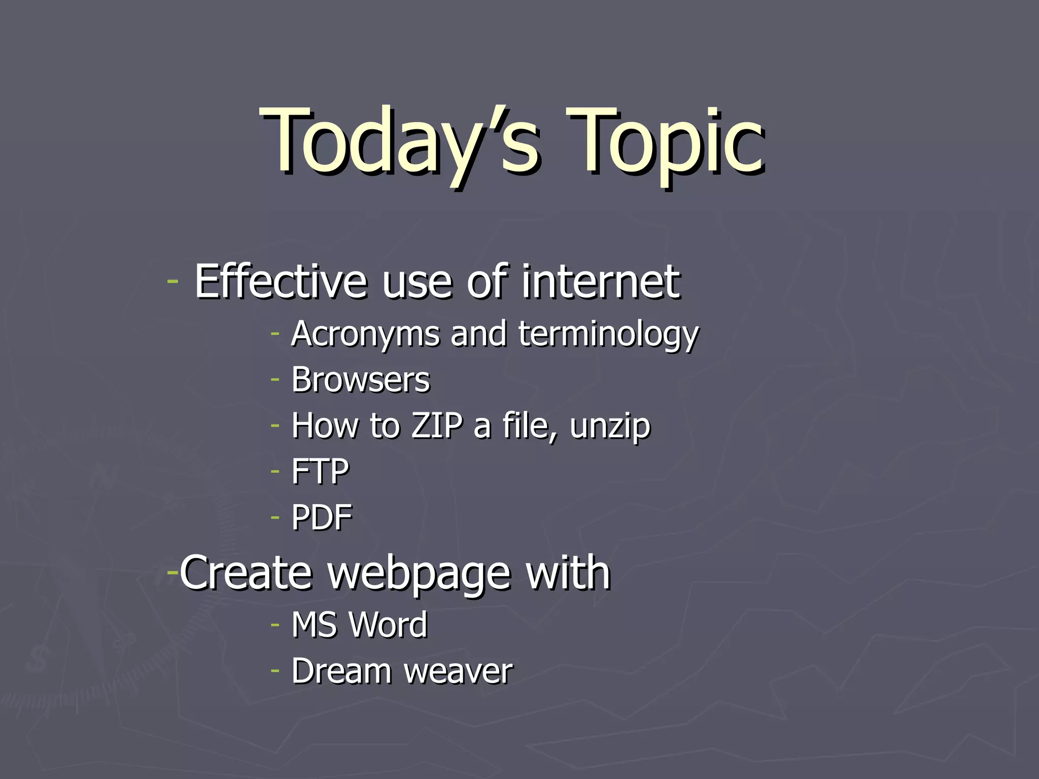 The document provides an overview of topics related to effective internet use, including acronyms and terminology, browsers, compressing and decompressing files, creating webpages, and useful links. It discusses topics such as what a browser is, how to zip and unzip files, how to create a basic webpage using Microsoft Word or Dreamweaver, and defines common terms like URLs, bandwidth, and HTML. Safety measures like virus protection software are also covered.