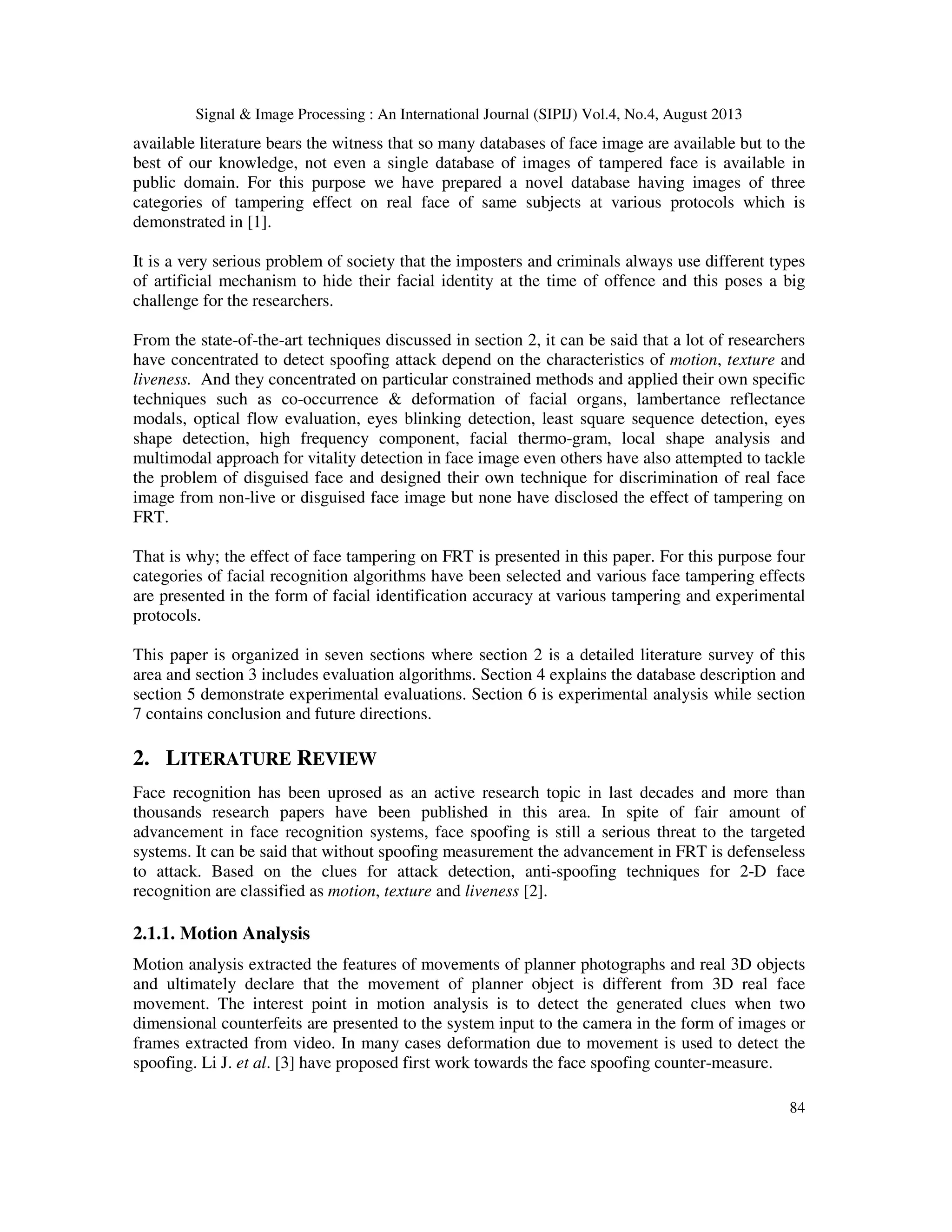 This document summarizes research on the effect of face tampering on face recognition. It discusses four categories of face recognition algorithms (PCA, iSVM, LBP, SIFT) and their accuracy rates under different tampering protocols using a novel tampered face image database. The conclusion is that it is unpredictable which algorithm will perform best for tampered face recognition. Motion analysis, texture analysis, and liveness detection techniques in prior research aimed to detect spoofing but may not distinguish tampered from real faces.