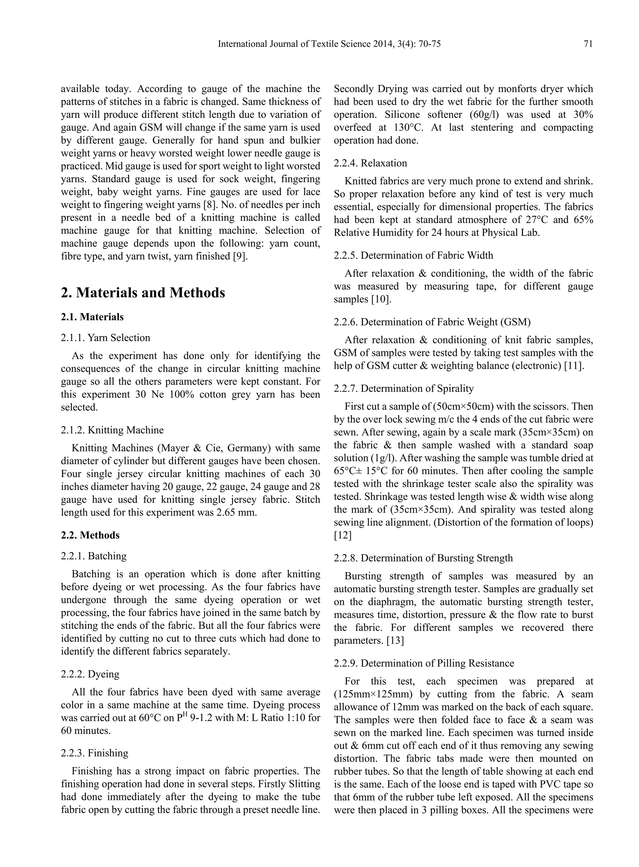 This paper investigates the impact of circular knitting machine gauge on the physical and mechanical properties of cotton knitted fabrics. Different gauges were employed while keeping other parameters constant, leading to variations in the finished width, GSM, shrinkage, spirality, bursting strength, and pilling resistance of the fabrics. The findings indicate that higher gauges often result in increased fabric width and weight, while lower gauges contribute to greater fabric strength and reduced spirality.