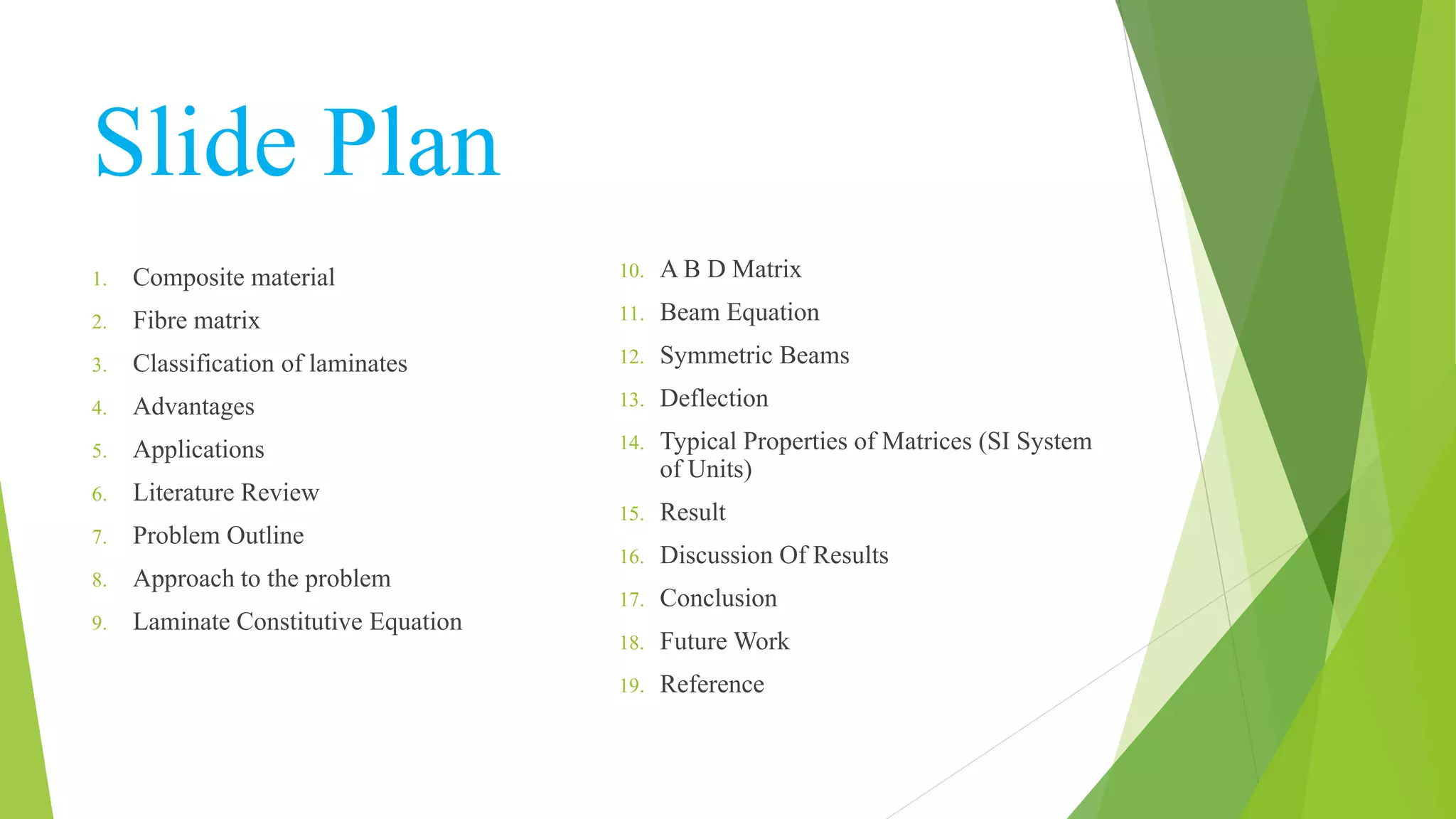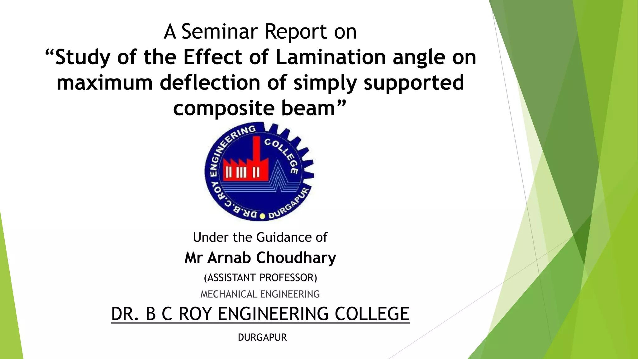 The seminar report investigates the impact of lamination angles on the maximum deflection of simply supported composite beams, specifically made of glass-epoxy materials. It details the methods used for analysis, including classical laminated beam theory and MATLAB simulations, and finds that the g-c-c-g arrangement of composite materials yields the minimum transverse deflection. Conclusions drawn highlight the effectiveness of this arrangement in practical applications and suggest future studies to explore variations in beam types and loading conditions.