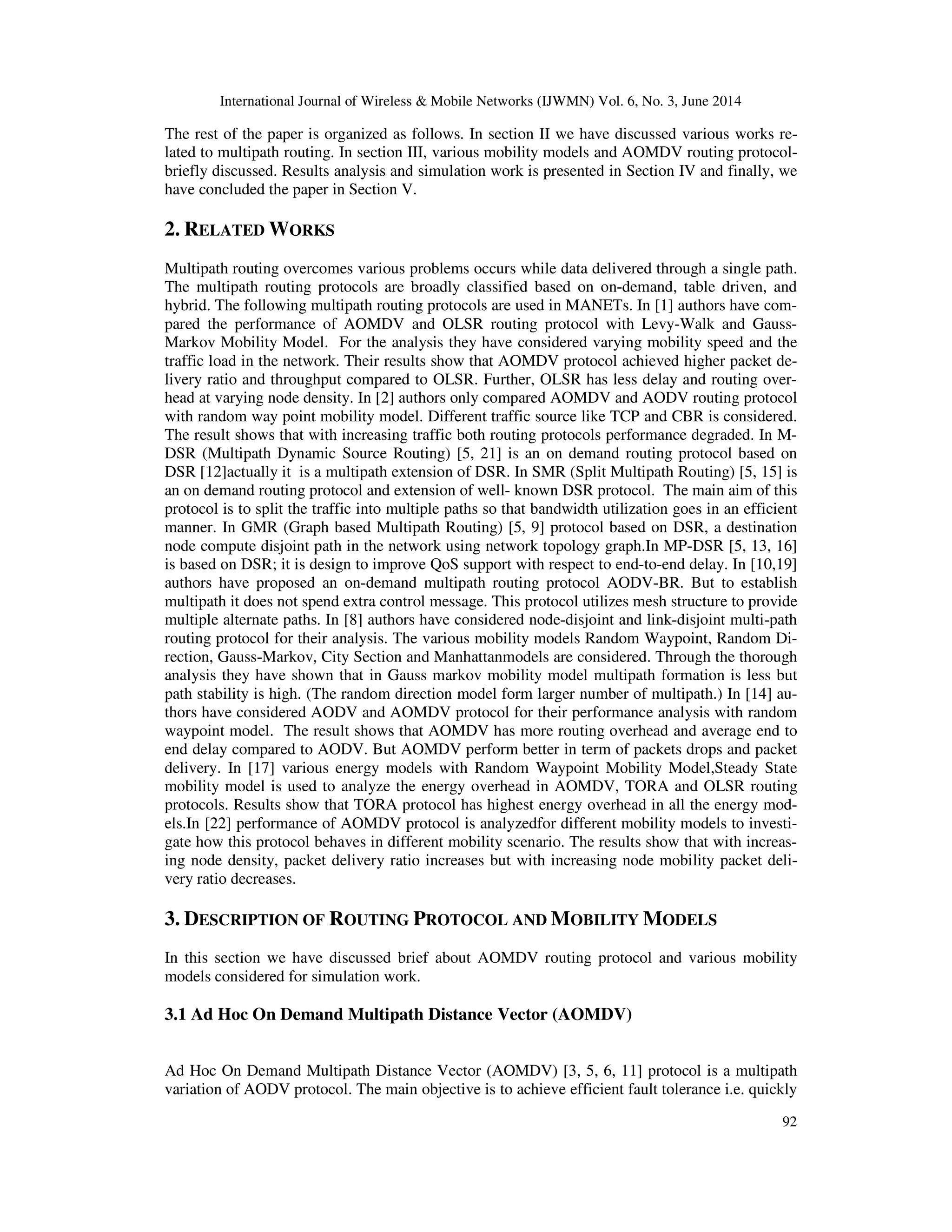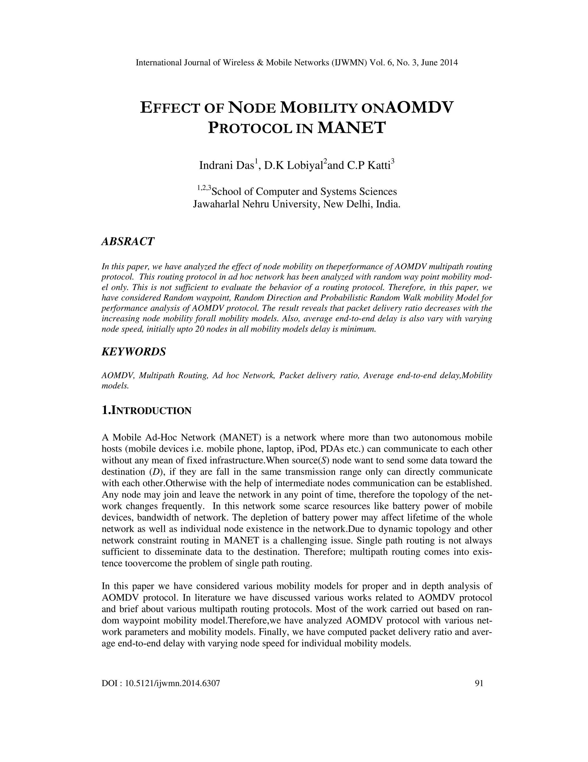 This paper analyzes the impact of node mobility on the performance of the AOMDV multipath routing protocol in Mobile Ad Hoc Networks (MANETs) using various mobility models. Results indicate that the packet delivery ratio decreases with increasing node mobility across all models, while average end-to-end delay varies with node speed, peaking with 60 nodes. The AOMDV protocol performs best under the random waypoint mobility model in terms of packet delivery ratio and average delay, but its performance declines as node mobility increases.