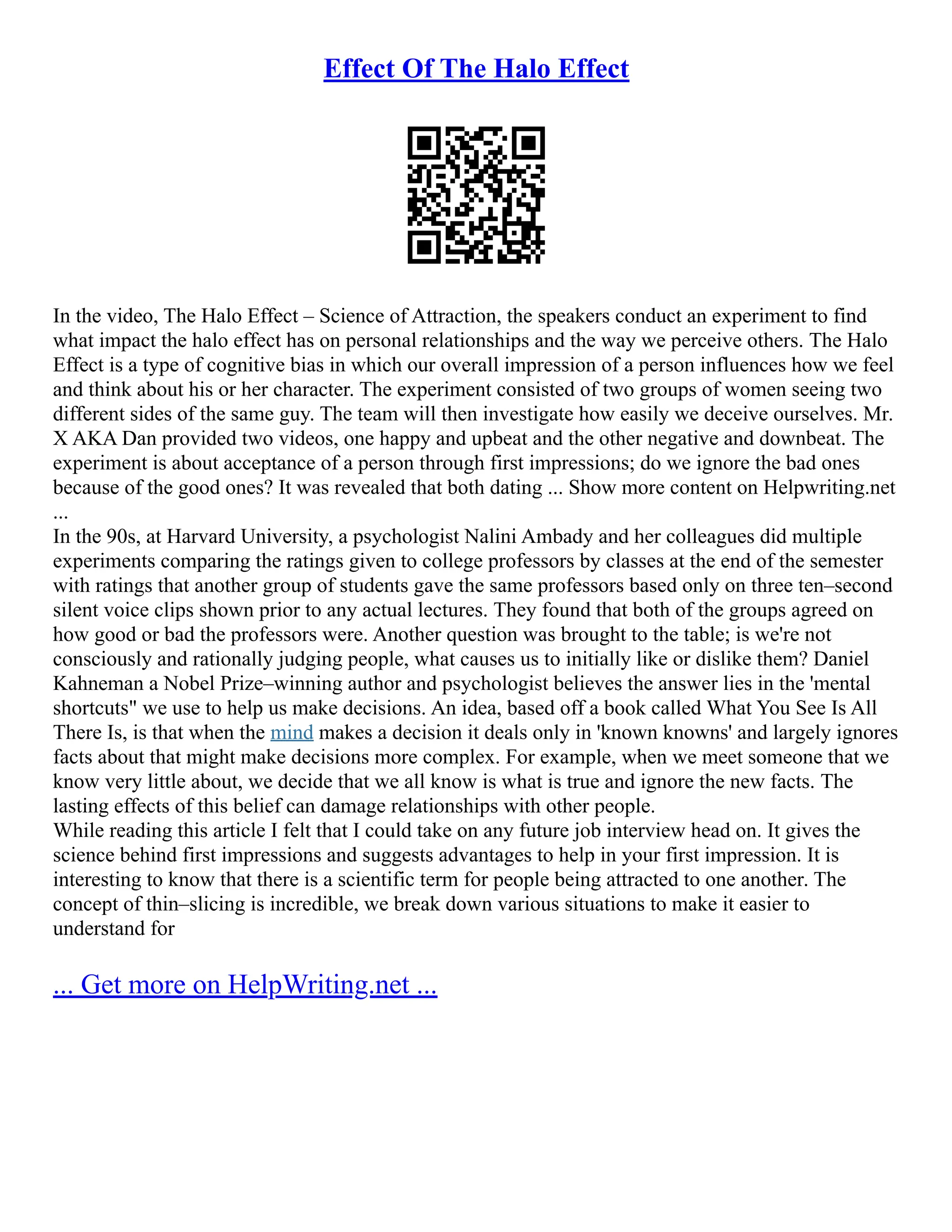 The document discusses the halo effect and how it can impact perceptions and relationships. An experiment was conducted showing two videos of the same person - one upbeat and one negative - to see if first impressions influenced perceptions. Studies found that brief silent clips of professors were enough for students to form opinions of their abilities that matched end-of-semester evaluations. The halo effect causes people to ignore new facts that contradict initial judgments due to relying on "mental shortcuts." This cognitive bias can damage relationships by causing people to deceive themselves about others based on first impressions.