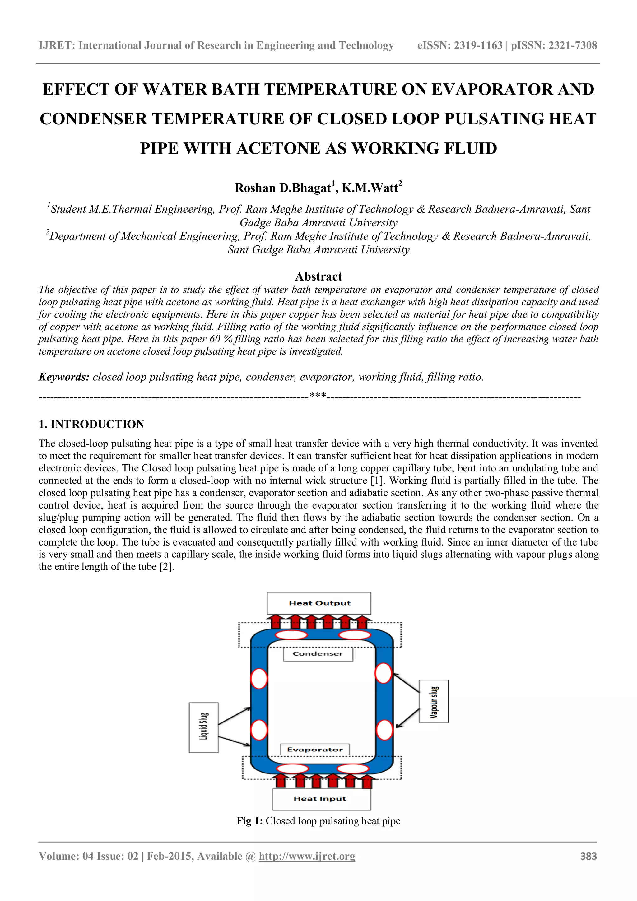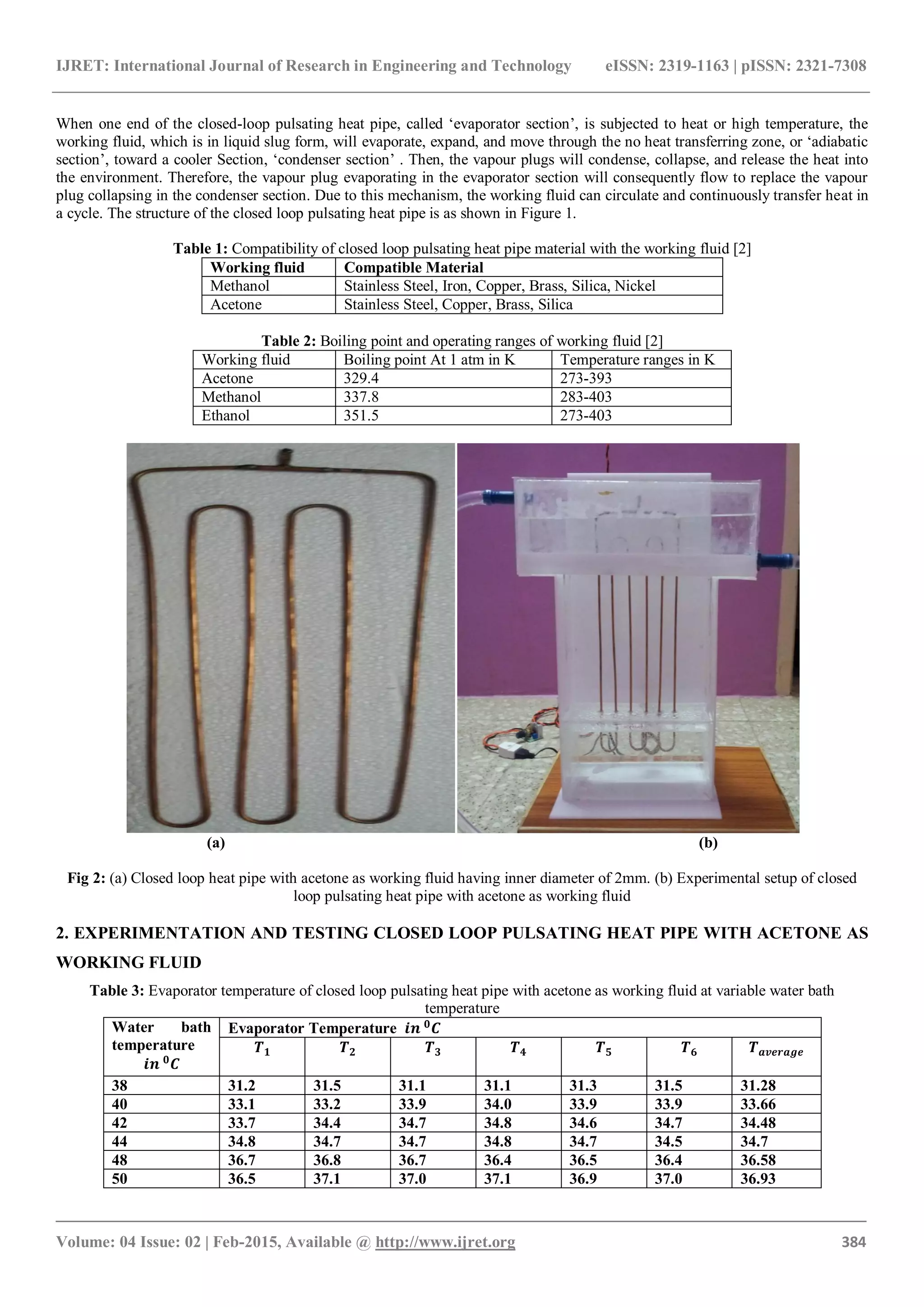 The document examines the impact of water bath temperature on the evaporator and condenser temperatures of a closed-loop pulsating heat pipe utilizing acetone as the working fluid. It concludes that increased water bath temperature correlates with higher evaporator and condenser temperatures, particularly noting rapid increases as temperatures approach acetone's boiling point. The study emphasizes that lower saturation temperature working fluids can enhance heat transfer performance.