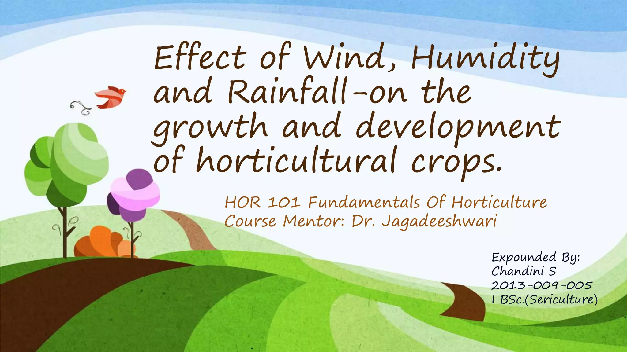 Wind, humidity, and rainfall can significantly impact the growth and development of horticultural crops. High winds can damage fruit trees through broken limbs and cause flowers to shed and fruits to drop. High humidity favors the spread of diseases and pests but also contributes to fruit cracking. The timing and amount of rainfall is also important, as rain during flowering can reduce fruit set, but normal rainfall creates good conditions for plant growth and harvest, while rains before harvest can soften fruits. Different climatic conditions impact the quality, taste, and storage capabilities of fruits. Windbreaks and planting crops suited to the local climate can help mitigate some of these effects.