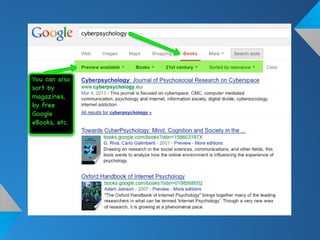 This document provides guidance on effective Google searching. It discusses Google's mission to organize the world's information and make it accessible. It also notes that Google profiles users to target advertising and its products may change. The document then provides examples of basic Google searches and demonstrates more advanced search techniques. It stresses evaluating sources and avoiding plagiarism. Finally, it includes an exercise for readers to practice advanced Google searches.