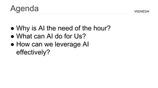This document discusses how organizations can leverage artificial intelligence (AI) effectively through experimentation. It recommends establishing a Center of Excellence for Experimentation (COE) to design, execute, and analyze AI experiments. The COE would measure the outputs and impact of AI programs, define best practices, and use an experimentation framework and maturity matrix to ensure the sustainable growth of experimentation. By taking a scientific approach of experimentation, organizations can better manage and measure AI applications to maximize their benefits.