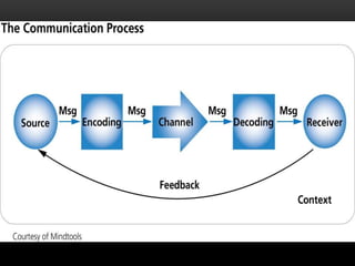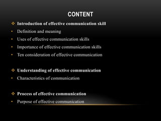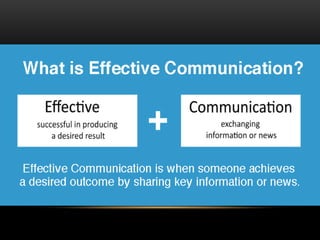 The document discusses effective communication skills. It defines effective communication as communication that produces the intended result. It explains the communication process, which involves a sender, message, encoding, channel, receiver, decoding, feedback, and potential noise. The presentation covers the importance of effective communication in business, such as building trust and improving productivity. It also provides considerations for effective communication, such as clarifying ideas before communicating and examining the true purpose.