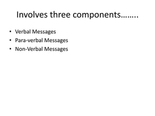 The document discusses the three components of effective communication: verbal messages, para-verbal messages, and non-verbal messages. It states that these components are used to send clear, concise messages and to correctly receive and understand messages. Specifically, it provides details on how to effectively use verbal messages, and the roles of para-verbal and non-verbal messages in communication. It also outlines best practices for listening, barriers to communication, and concludes that effective communication is two-way, involves active listening and feedback, and is clear, accountable, and stress-free.
