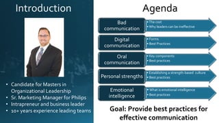 This document provides best practices for effective communication in leadership, highlighting the consequences of poor communication, including substantial financial losses for organizations. It emphasizes the importance of digital and oral communication, emotional intelligence, and fostering a strength-based culture to enhance leadership effectiveness. Various communication techniques and media usage are discussed, alongside strategies for presentations and audience engagement.
