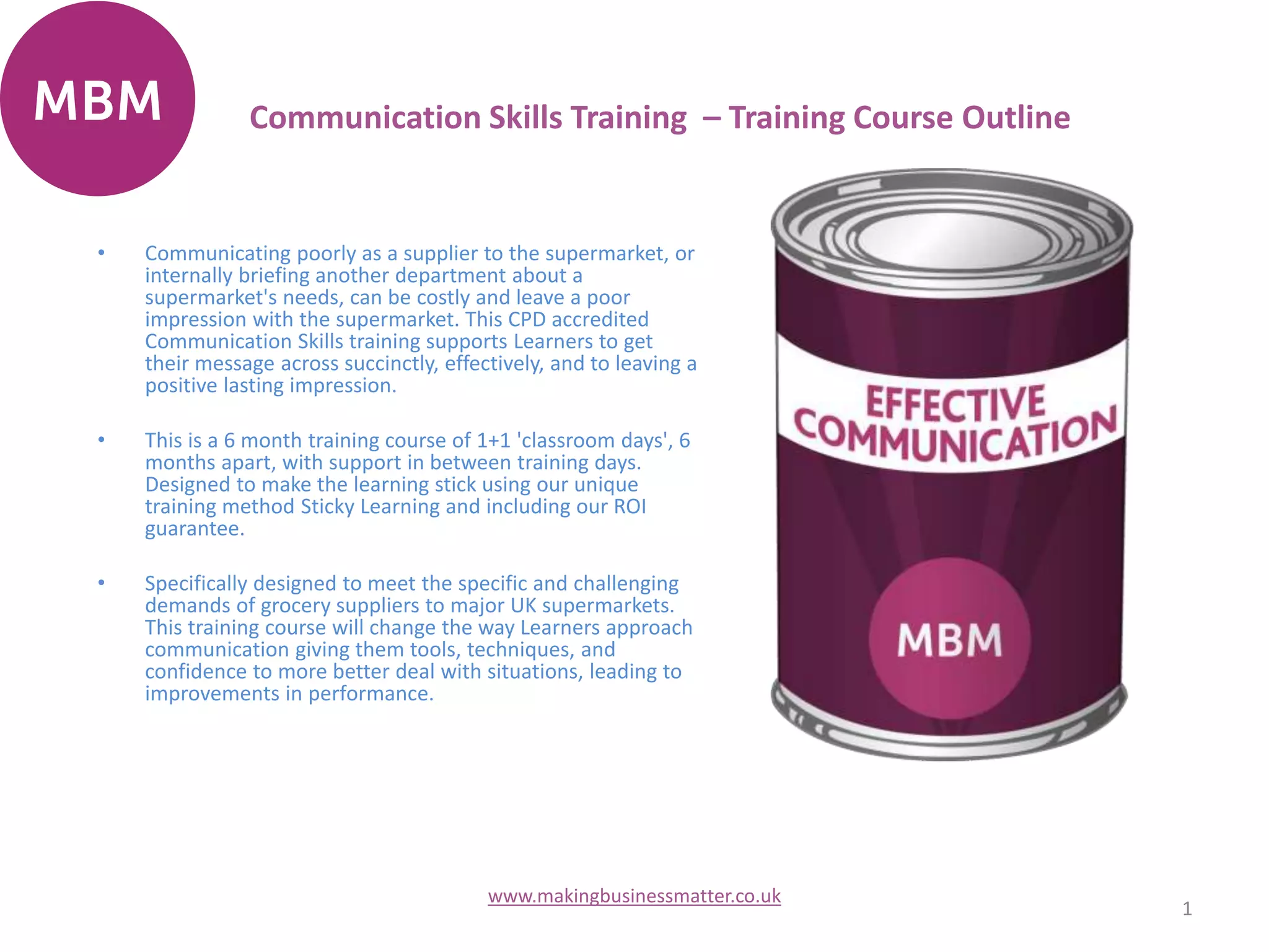 The communication skills training course is a 6-month program designed for grocery suppliers to major UK supermarkets, focusing on improving communication effectiveness through various learning techniques. Participants will gain insights into different communication styles, body language, and strategies for handling conflicts, ensuring a positive impact on their professional interactions. The course incorporates a unique method called 'sticky learning' to enhance knowledge retention, along with ongoing support and options for individual coaching.