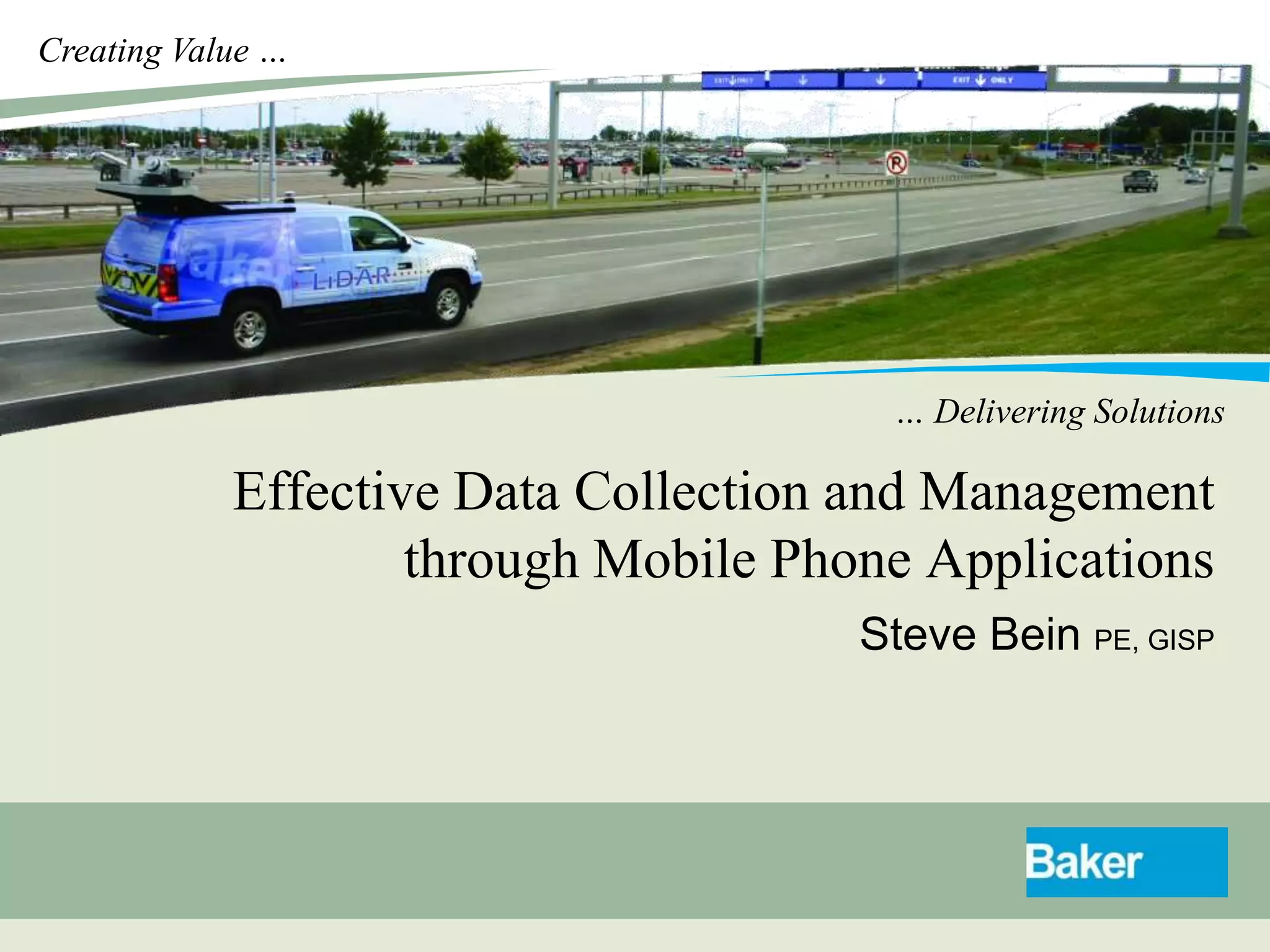 This document discusses how mobile phone applications can effectively collect and manage data. It provides examples of using mobile apps for tasks like public needs assessments, design work, and capturing or analyzing large amounts of data by leveraging mobile technologies. Specific considerations for deploying smartphone apps include platform choice, connectivity needs, ruggedness, battery life, and GPS accuracy. The document outlines benefits like improved user efficiency, low costs, and ability to integrate maps, cameras, and GPS. Examples illustrated include infrastructure condition assessments, regulatory delineations, and stormwater permit tracking using mobile GIS apps.